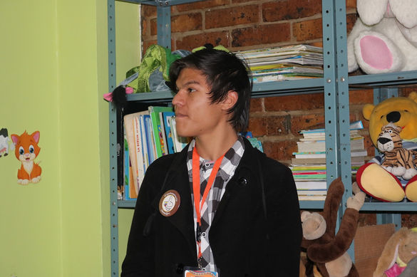 Doris Falcon encargado de proyecto de Fe y Alegría, Anadres Ramos de Gurpo COMUNICARTE, en una dinamica del taller